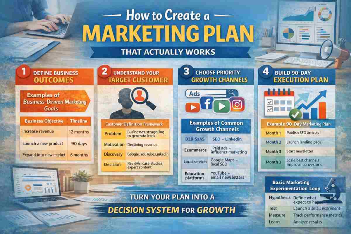 Creating a marketing plan is not simply about filling out a template or producing a long document for presentations. The real purpose of a marketing plan is to build a clear system that helps a business make smarter marketing decisions over time. A practical marketing plan should connect marketing activities directly to business outcomes, identify the most effective channels for reaching the target audience, and provide a structured way to test and improve strategies. Instead of trying to cover every possible marketing tactic, successful companies focus on a few high-impact channels and continuously refine their approach based on real performance data. When a marketing plan is built around clear goals, customer understanding, strategic channel selection, and ongoing experimentation, it becomes more than just a document—it becomes a reliable framework that guides consistent growth and smarter marketing execution.